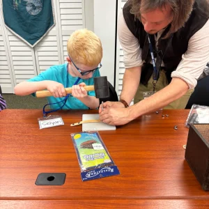 - At the forge, Blacksmith Caspian taught a leatherworking workshop where students stamped their names into leather bracelets, using tactile tools and techniques.